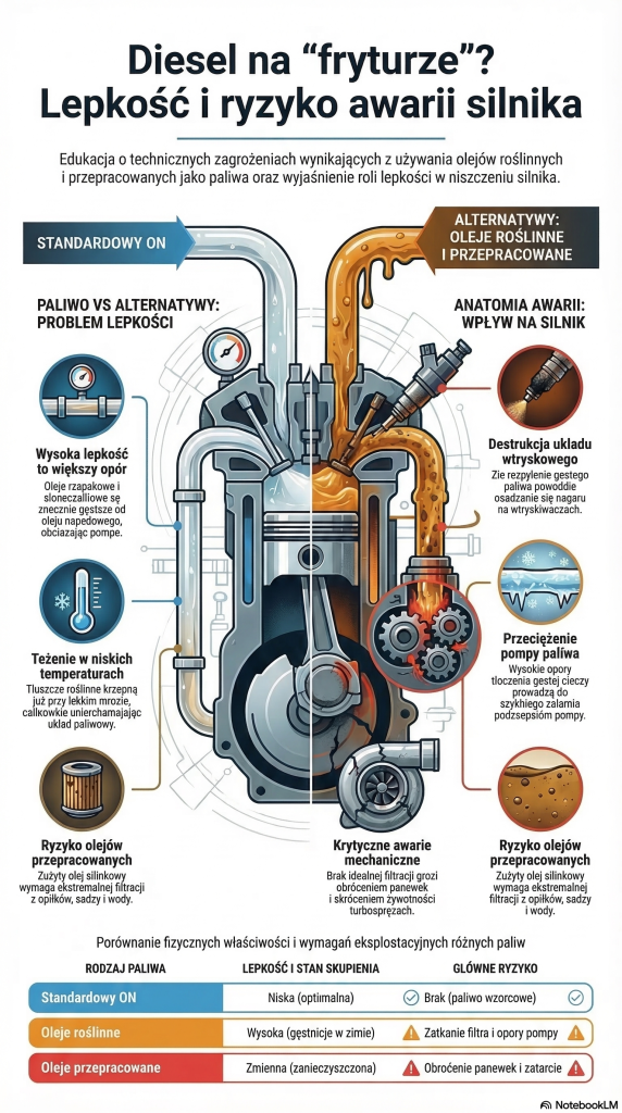 5. Czy jazda na zużytej „fryturze” lub oleju silnikowym jest bezpieczna? Jest to obarczone ogromnym ryzykiem. Takie substancje wymagają niezwykle restrykcyjnej filtracji w celu usunięcia sadzy, wody i opiłków metalu. Zignorowanie tego procesu grozi katastrofalną awarią, np. obróceniem panewek.